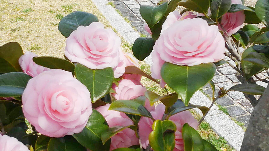 Tsubaki (椿, Camellia) flowers have beautiful petals, and is traditionally appreciated in tea ceremonies. Some people say it's more beautiful when it has fallen on the mossy ground than while it is still on the tree.
