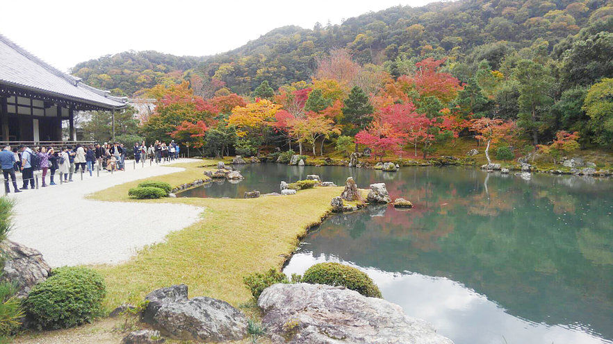 Unfortunately, no original buildings have survived the many fires, but its garden called Sogenchi-teien (曹源池庭園) hasn't been changed a bit since the temple's foundation. It's a Chisen-Kaiyu-shiki-teien (池泉廻遊式庭園, go around the pond style garden) landscaped by Muso Soseki (夢窓疎石), the first priest of the temple.